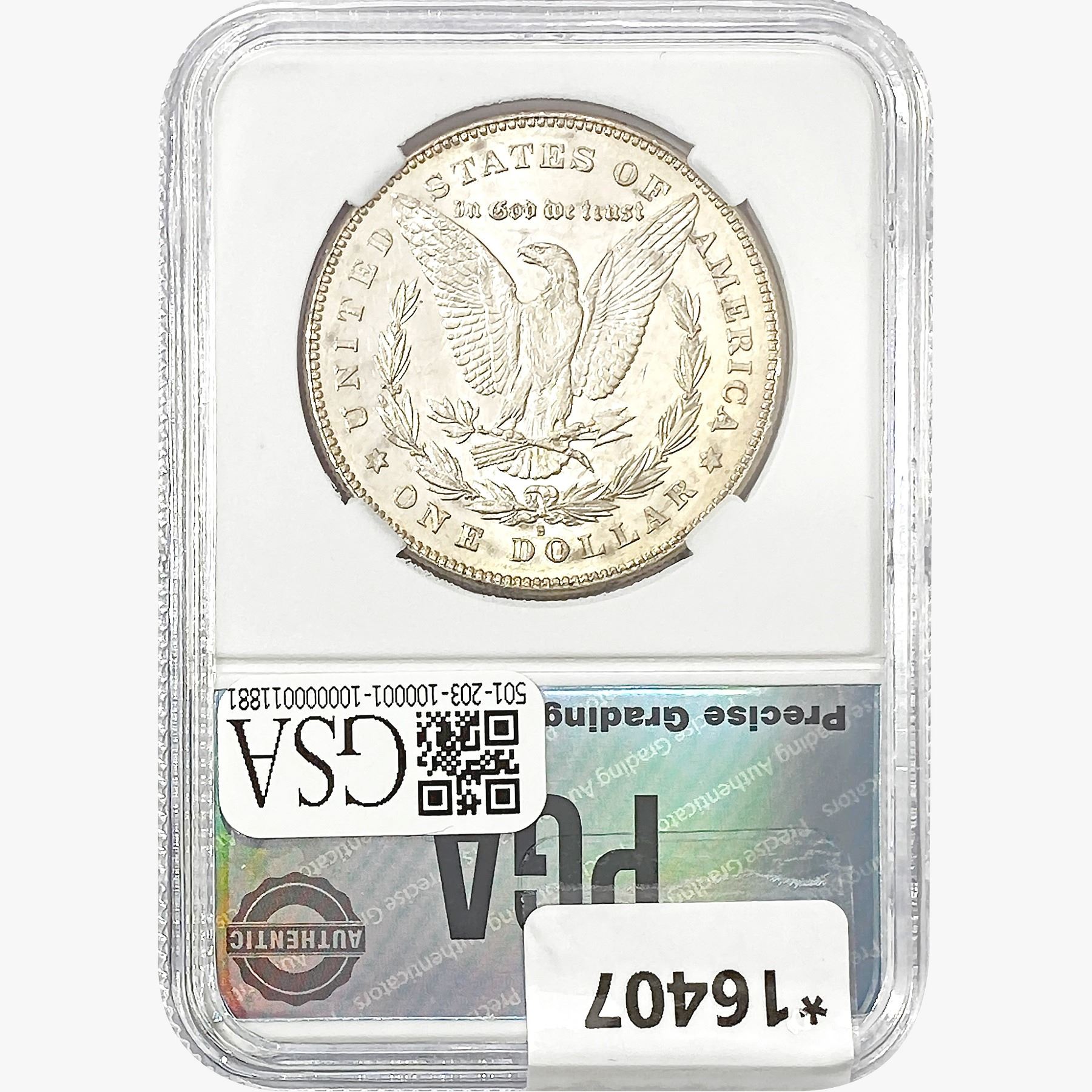 COINS AND CURRENCY LISTED IN GSA’S CATALOG AS GRADED AND ENCAPSULATED BY PCGS, NGC, ANACS, ICG, PCGS CURRENCY, PMG, PCGS BANKNOTE GRADING, CMC OR ANY OTHER THIRD-PARTY GRADING SERVICE ARE LIKEWISE SOLD “AS-IS” EXCEPT AS EXPRESSLY SET FORTH HEREIN. ALL THIRD-PARTY GRADING SERVICE GUARANTEES, INCLUDING AUTHENTICITY, ARE THE SOLE RESPONSIBILITY OF THE THIRD-PARTY GRADING SERVICE AND NOT WARRANTIES OR GUARANTEES OF GSA. BIDDERS SHOULD CONTACT THESE THIRD-PARTY GRADING SERVICES DIRECTLY WITH RESPECT TO ANY CLAIMS OR QUESTIONS THEY MAY HAVE CONCERNING THEIR GUARANTEES AND WARRANTIES. BIDDERS ACKNOWLEDGE AND AGREE THAT AUCTIONEER IS NOT BOUND BY OR LIABLE FOR ANY OPINION OR CERTIFICATION BY ANY THIRD-PARTY GRADING SERVICE. REMOVAL OF A PRODUCT FROM ITS PROTECTIVE CASING OR HOLDER OR ALTERATION OF ANY COIN HOLDER WAIVES ALL RIGHTS CONCERNING THE PRODUCT CONTAINED THEREIN.