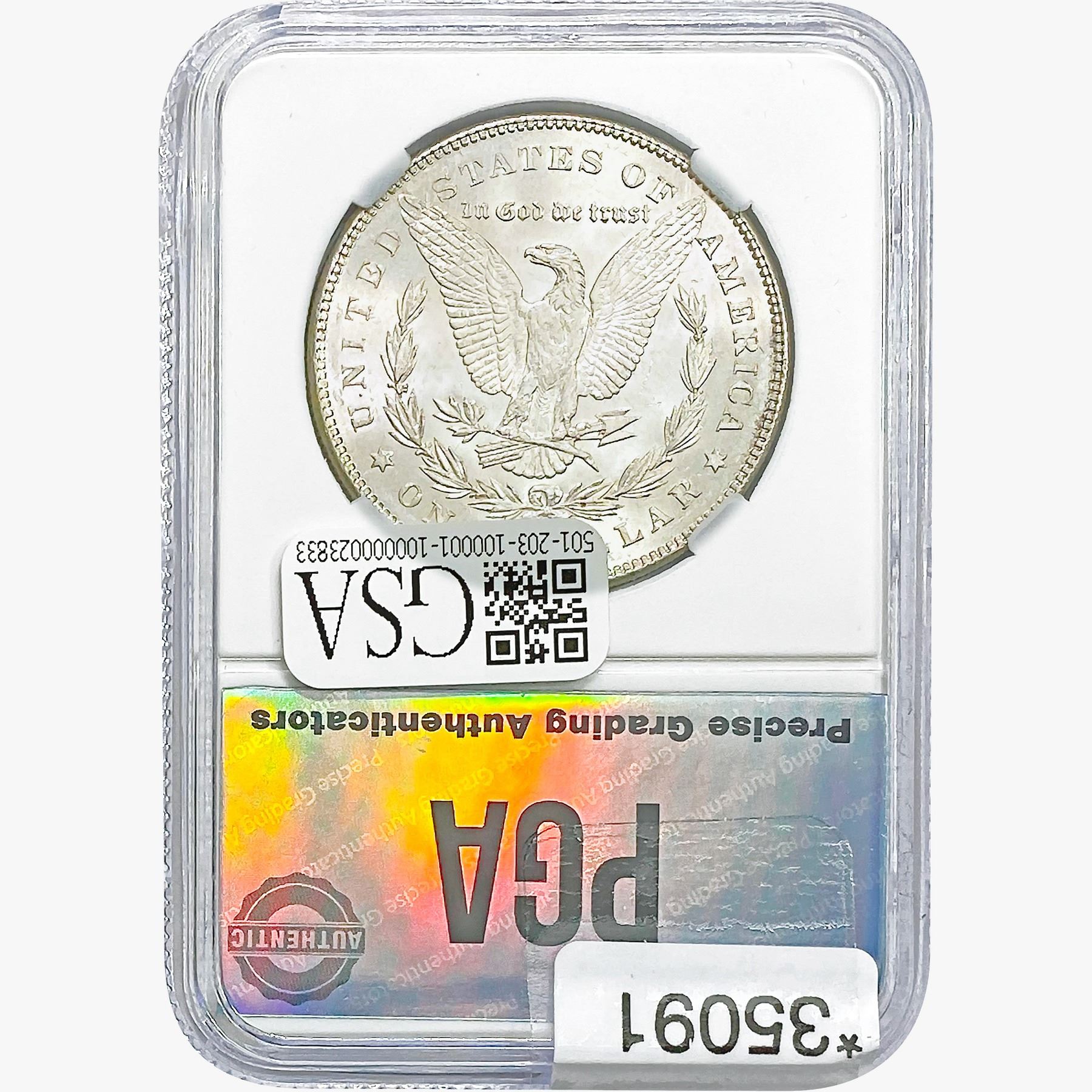 COINS AND CURRENCY LISTED IN GSA’S CATALOG AS GRADED AND ENCAPSULATED BY PCGS, NGC, ANACS, ICG, PCGS CURRENCY, PMG, PCGS BANKNOTE GRADING, CMC OR ANY OTHER THIRD-PARTY GRADING SERVICE ARE LIKEWISE SOLD “AS-IS” EXCEPT AS EXPRESSLY SET FORTH HEREIN. ALL THIRD-PARTY GRADING SERVICE GUARANTEES, INCLUDING AUTHENTICITY, ARE THE SOLE RESPONSIBILITY OF THE THIRD-PARTY GRADING SERVICE AND NOT WARRANTIES OR GUARANTEES OF GSA. BIDDERS SHOULD CONTACT THESE THIRD-PARTY GRADING SERVICES DIRECTLY WITH RESPECT TO ANY CLAIMS OR QUESTIONS THEY MAY HAVE CONCERNING THEIR GUARANTEES AND WARRANTIES. BIDDERS ACKNOWLEDGE AND AGREE THAT AUCTIONEER IS NOT BOUND BY OR LIABLE FOR ANY OPINION OR CERTIFICATION BY ANY THIRD-PARTY GRADING SERVICE. REMOVAL OF A PRODUCT FROM ITS PROTECTIVE CASING OR HOLDER OR ALTERATION OF ANY COIN HOLDER WAIVES ALL RIGHTS CONCERNING THE PRODUCT CONTAINED THEREIN.