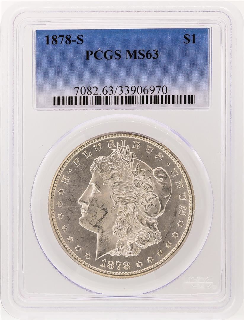 One 1878-S PCGS MS63 Morgan Silver Dollar. PCGS Certified.