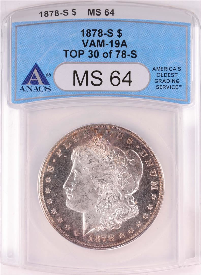 One 1878-S Reverse of 1878 $1 Morgan Silver Dollar Coin ANACS MS64 Top 30 VAM19-A. ANACS Certified.