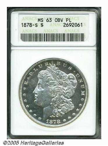 <B>1878-S<S$1> MS63 Obverse Prooflike ANACS.</B></I> Although the ANACS insert only states the obverse is prooflike, the reverse is also notably mirrored and appears to be equally worthy of the Prooflike designation. The devices are frosty and display noticeable contrast. Brilliant, well struck, and carefully preserved.