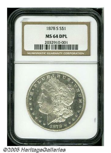 <B>1878-S<S$1> MS64 Deep Mirror Prooflike NGC.</B></I> Untoned and boasting a considerable degree of cameo contrast. Choice and better DMPL examples of this premier San Francisco issue are much scarcer than their subsequent S-mint counterparts.
