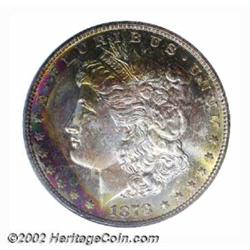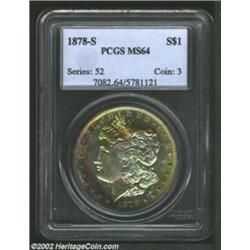 1878-S S$1 MS64 PCGS. Fully struck with bright mint luster. The obverse has fabulous end-of-the-roll toning and every color in the light spectrum is represented on that side. The reverse, on the other hand, has only one color: full, original mint brilliance. Important notice: We expect to be auctioning lots at the rate of 200-250 per hour. Sometimes eBay Premier live bid software cannot keep up with that pace, so we strongly recommend that you place a realistic proxy bid now as insurance to avoid disappointment. Also please note that all Heritage/CAA lots purchased through eBay Premier carry a 20% Buyer's Premium. Please make sure you read the Terms and Conditions.