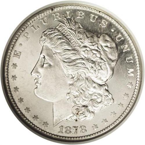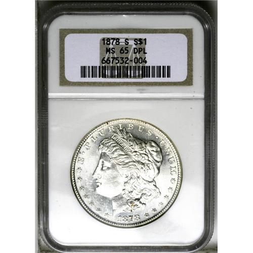 <B>1878-S<img border='0' src='http://www.heritagecoins.com/images/star.gif' width=10 height=10>$1> MS65 Deep Mirror Prooflike NGC.</B></I> While plentifully available as a one-sided prooflike, the 1878-S is scarce as a full, two-sided prooflike, especially with deeply mirrored fields. This is a brilliant coin that shows basined fields that have a slightly concave appearance. The fields are noticeably frosted and the striking details are fully defined throughout. Census: 25 in 65, 0 finer (8/06).