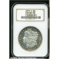 <B>1878-S<S$1> MS65 Deep Mirror Prooflike NGC.</B></I> Impressive white on black contrast and deeply reflective fields ensure the eye appeal of this splendidly preserved and meticulously struck Gem. Hints of honey-gold patina visit the obverse border. Not a rare date in Mint State grades, but very scarce as a Deep Mirror Gem. Population: 24 in 65 Deep Mirror Prooflike, none finer (4/04). <BR><BR><B>Important notice:</B> Heritage usually auctions material at the rate of 200-250 lots per hour. On some occasions eBay Live bid software or the Internet may not be able to keep up with the pace of the auction. We recommend placing a realistic absentee bid now as insurance to avoid disappointment. Occasionally the auctioneer may eliminate or reject an eBay Live bid, and the auctioneer may also reopen a lot after the close of the eBay live bidding (usually because we missed an audience bid), and may reject your bid even if it shows you as the winning bidder. By bidding via eBay Live, you agree that Heritage may award the lot to another bidder at its sole discretion under the circumstances described above or any other reasonable circumstances. Since eBay bids are not shown to us until we open the lot on the floor, we treat those bids just like floor bids. In most cases the floor responds before the eBay bid is presented to us, due to Internet lag time, so for consistency we have made it a policy that floor bids are always considered first over tie eBay live bids. Also please note that all Heritage lots purchased through eBay Live carry a 20% Buyer's Premium. Please make sure you read the Terms and Conditions before you bid.