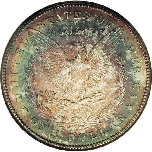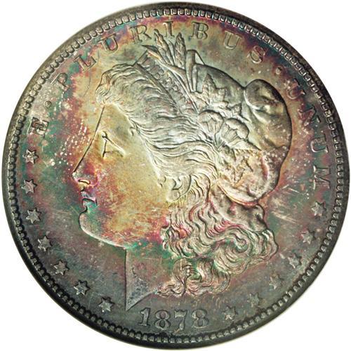 <B>1878-S<img border='0' src='http://www.heritagecoins.com/images/star.gif' width=10 height=10>$1> MS65 NGC.</B></I> Well struck and vibrantly lustrous, with deep variegated patina over both sides. Dark-purple lower obverse color evolves into bright rainbow toning on the upper regions. Lighter shades of lilac, purple, and electric-blue adorn the reverse. A gorgeous, colorful Gem.
