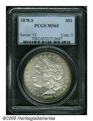 <B>1878-S<S$1> MS65 PCGS.</B></I> A beautiful and boldly struck Gem with booming luster and a hint of peach color near the rims. Close to a higher grade despite a small mark near the bust truncation.
