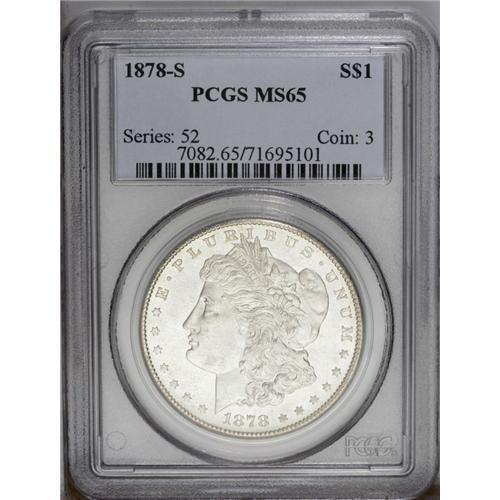 <B>1878-S<img border='0' src='http://www.heritagecoins.com/images/star.gif' width=10 height=10>$1 MS65 PCGS.</B></I> Brilliant and satiny with slightly reflective fields. A few tiny abrasions are present, mostly on the reverse.<BR><I>From The Leslie E. Lunsford Collection, #7 Current Finest Registry Morgan Dollars Basic Set, Circulation Strikes.</B></I>