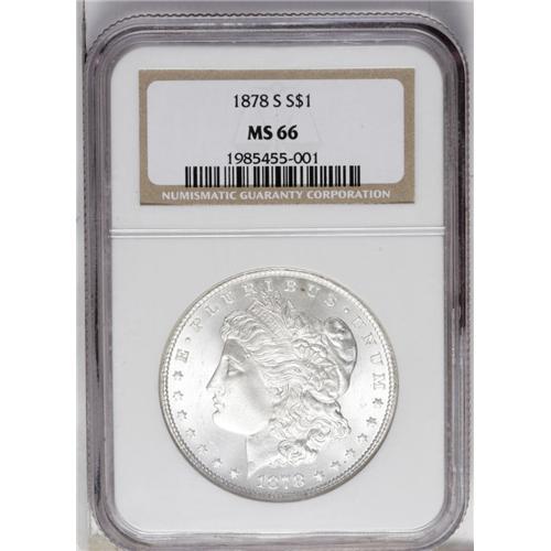 <B>1878-S<img border='0' src='http://www.heritagecoins.com/images/star.gif' width=10 height=10>$1> MS66 NGC.</B></I> A sharply struck example from the first year of issue with plenty of luster. Untoned save for a small golden-brown spot between the B and U of PLURIBUS.