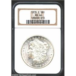 1878-S S$1 MS66 NGC. A well struck Gem that has flashy semi-prooflike fields. Lightly toned and carefully preserved with pleasing eye appeal. Important notice: We expect to be auctioning lots at the rate of 200-250 per hour. Sometimes eBay Premier live bid software cannot keep up with that pace, so we strongly recommend that you place a realistic proxy bid now as insurance to avoid disappointment. Also please note that all Heritage/CAA lots purchased through eBay Premier carry a 20% Buyer's Premium. Please make sure you read the Terms and Conditions.