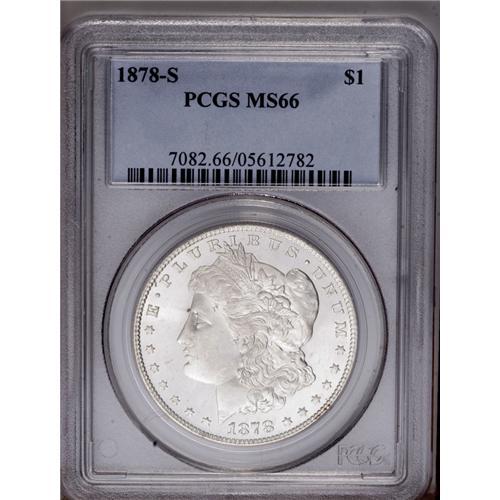 <B>1878-S<img border='0' src='http://www.heritagecoins.com/images/star.gif' width=10 height=10>$1> MS66 PCGS.</B></I> A semi-prooflike beauty that provides an exacting strike and dazzling mint luster. An untoned and refreshingly clean representative of the short-lived Reverse of 1878 subtype. One tiny spot is noted in the field near the eye. <BR><BR><B>Important notice:</B> Heritage usually auctions material at the rate of 200-250 lots per hour. On some occasions eBay Live bid software or the Internet may not be able to keep up with the pace of the auction. We recommend placing a realistic absentee bid now as insurance to avoid disappointment. Occasionally the auctioneer may eliminate or reject an eBay Live bid, and the auctioneer may also reopen a lot after the close of the eBay live bidding (usually because we missed an audience bid), and may reject your bid even if it shows you as the winning bidder. By bidding via eBay Live, you agree that Heritage may award the lot to another bidder at its sole discretion under the circumstances described above or any other reasonable circumstances. Since eBay bids are not shown to us until we open the lot on the floor, we treat those bids just like floor bids. In most cases the floor responds before the eBay bid is presented to us, due to Internet lag time, so for consistency we have made it a policy that floor bids are always considered first over tie eBay live bids. Also please note that all Heritage lots purchased through eBay Live carry a 20% Buyer's Premium. Please make sure you read the Terms and Conditions before you bid. This lot is being auctioned in conjunction with a live floor auction by Heritage Galleries & Auctioneers. All final auction and invoice information will be supplied by Heritage Galleries & Auctioneers, and all other information should be considered preliminary. Lot:3223 <BR><BR><B>Winning Notification and Billing:</B> After the FINAL session in this auction is complete, Heritage will send e-mail and snail mail invoices. This process normally takes several days. All final auction and invoice information will be supplied by Heritage Galleries & Auctioneers, and all other information should be considered preliminary. <BR><BR>This auction will be conducted on a live auction floor and over the Internet through eBay Live. If you choose to place an absentee bid, please take a moment to <font color='#0000ff'><u><a href='http://pages.ebay.com/liveauctions/help/before/laabsentee.html'>learn how eBay Live absentee bidding works</a></u></font><font color='#000000'>