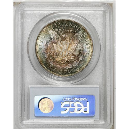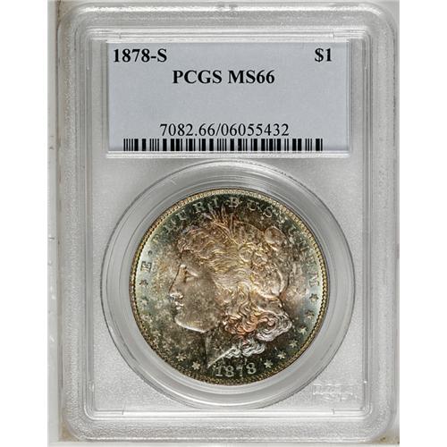 <B>1878-S<img border='0' src='http://www.heritagecoins.com/images/star.gif' width=10 height=10>$1> MS66 PCGS.</B></I> Beautifully toned in loosely concentric yellow-green, blue, and violet around an orange center. Boldly struck with excellent luster and minimal flaws.