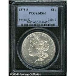 1878-S S$1 MS66 PCGS. Booming luster and an exquis <B>1878-S S$1 MS66 PCGS.</B></I> Booming luster and an exquisite strike affirm the quality of this lovingly preserved Second Reverse premium Gem. A trace of apricot color, but close to fully brilliant. <BR><BR><B>Important notice:</B> Heritage usually auctions material at the rate of 200-250 lots per hour. On some occasions eBay Live bid software or the Internet may not be able to keep up with the pace of the auction. We recommend placing a realistic absentee bid now as insurance to avoid disappointment. Occasionally the auctioneer may eliminate or reject an eBay Live bid, and the auctioneer may also reopen a lot after the close of the eBay live bidding (usually because we missed an audience bid), and may reject your bid even if it shows you as the winning bidder. By bidding via eBay Live, you agree that Heritage may award the lot to another bidder at its sole discretion under the circumstances described above or any other reasonable circumstances. Since eBay bids are not shown to us until we open the lot on the floor, we treat those bids just like floor bids. In most cases the floor responds before the eBay bid is presented to us, due to Internet lag time, so for consistency we have made it a policy that floor bids are always considered first over tie eBay live bids. Also please note that all Heritage lots purchased through eBay Live carry a 20% Buyer's Premium. Please make sure you read the Terms and Conditions before you bid. This lot is being auctioned in conjunction with a live floor auction by Heritage Galleries & Auctioneers. All final auction and invoice information will be supplied by Heritage Galleries & Auctioneers, and all other information should be considered preliminary. Lot:7314