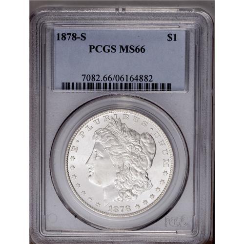 <B>1878-S<img border='0' src='http://www.heritagecoins.com/images/star.gif' width=10 height=10>$1> MS66 PCGS.</B></I> Fully brilliant and well struck with some reverse reflectivity and a bold, sharp strike overall. Always popular as a first year issue. <BR><BR><B>Important notice:</B> Heritage usually auctions material at the rate of 200-250 lots per hour. On some occasions eBay Live bid software or the Internet may not be able to keep up with the pace of the auction. We recommend placing a realistic absentee bid now as insurance to avoid disappointment. Occasionally the auctioneer may eliminate or reject an eBay Live bid, and the auctioneer may also reopen a lot after the close of the eBay live bidding (usually because we missed an audience bid), and may reject your bid even if it shows you as the winning bidder. By bidding via eBay Live, you agree that Heritage may award the lot to another bidder at its sole discretion under the circumstances described above or any other reasonable circumstances. Since eBay bids are not shown to us until we open the lot on the floor, we treat those bids just like floor bids. In most cases the floor responds before the eBay bid is presented to us, due to Internet lag time, so for consistency we have made it a policy that floor bids are always considered first over tie eBay live bids. Also please note that all Heritage lots purchased through eBay Live carry a 20% Buyer's Premium. Please make sure you read the Terms and Conditions before you bid. This lot is being auctioned in conjunction with a live floor auction by Heritage Galleries & Auctioneers. All final auction and invoice information will be supplied by Heritage Galleries & Auctioneers, and all other information should be considered preliminary. Lot:3224 <BR><BR><B>Winning Notification and Billing:</B> After the FINAL session in this auction is complete, Heritage will send e-mail and snail mail invoices. This process normally takes several days. All final auction and invoice information will be supplied by Heritage Galleries & Auctioneers, and all other information should be considered preliminary. <BR><BR>This auction will be conducted on a live auction floor and over the Internet through eBay Live. If you choose to place an absentee bid, please take a moment to <font color='#0000ff'><u><a href='http://pages.ebay.com/liveauctions/help/before/laabsentee.html'>learn how eBay Live absentee bidding works</a></u></font><font color='#000000'>