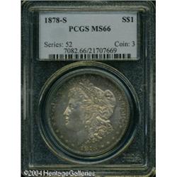 1878-S S$1 MS66 PCGS. Sharply struck, with cobalt- <B>1878-S S$1 MS66 PCGS.</B></I> Sharply struck, with cobalt-blue toning at the rims and olive-gold centers. The lustrous surfaces are well preserved without any significant marks. <BR><BR><B>Important notice:</B> Heritage usually auctions material at the rate of 200-250 lots per hour. On some occasions eBay Live bid software or the Internet may not be able to keep up with the pace of the auction. We recommend placing a realistic absentee bid now as insurance to avoid disappointment. Occasionally the auctioneer may eliminate or reject an eBay Live bid, and the auctioneer may also reopen a lot after the close of the eBay live bidding (usually because we missed an audience bid), and may reject your bid even if it shows you as the winning bidder. By bidding via eBay Live, you agree that Heritage may award the lot to another bidder at its sole discretion under the circumstances described above or any other reasonable circumstances. Since eBay bids are not shown to us until we open the lot on the floor, we treat those bids just like floor bids. In most cases the floor responds before the eBay bid is presented to us, due to Internet lag time, so for consistency we have made it a policy that floor bids are always considered first over tie eBay live bids. Also please note that all Heritage lots purchased through eBay Live carry a 20% Buyer's Premium. Please make sure you read the Terms and Conditions before you bid. This lot is being auctioned in conjunction with a live floor auction by Heritage Galleries & Auctioneers. All final auction and invoice information will be supplied by Heritage Galleries & Auctioneers, and all other information should be considered preliminary. Lot:7317