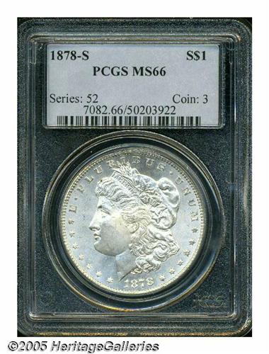 <B>1878-S<S$1> MS66 PCGS.</B></I> The 1878-S is a popular and, through MS65, plentiful early San Francisco Mint dollar. It becomes somewhat more difficult in Premium Gem, the grade of the specimen we offer here. Its availability drops off considerably in higher states of preservation, where PCGS and NGC combined have certified only 43 specimens (4/05). This example portrays excellent delineation on all of the design features, and has bright luminous surfaces. A touch of gray-tan patina is noted on the motifs. The surfaces are well preserved, displaying just a couple of small contact marks on Liberty's forehead.