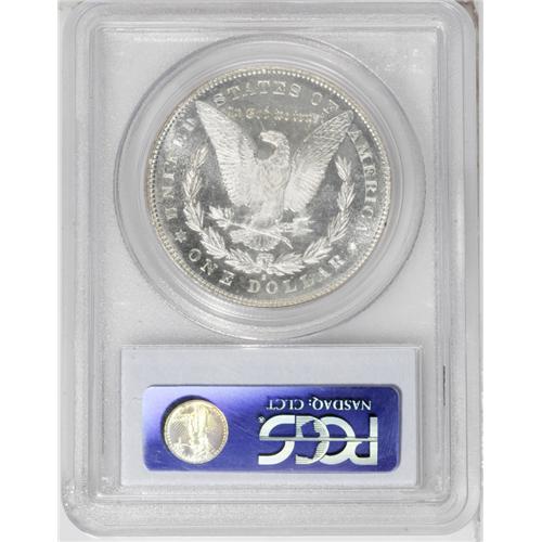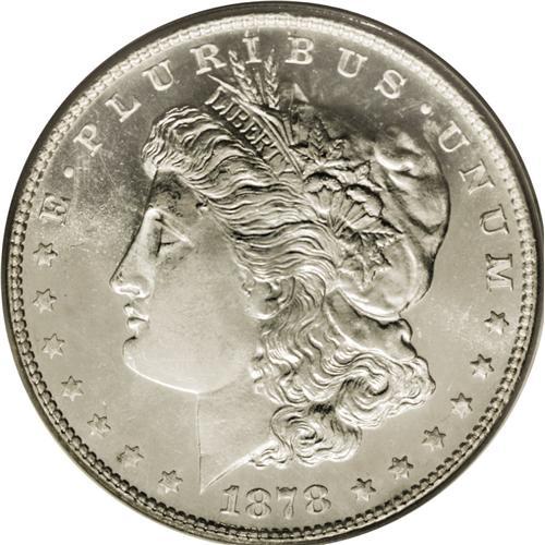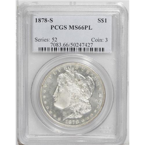 <B>1878-S<img border='0' src='http://www.heritagecoins.com/images/star.gif' width=10 height=10>$1> MS66 Prooflike PCGS.</B></I> This is a white coin with attractive frost over the devices and reflective surfaces that fall a little short of the DMPL classification. Surfaces are quite smooth, as expected from the Premium Gem grade, with very few distracting marks in the fields. While San Francisco Morgans from 1879-1882 are very common with prooflike surfaces even in the highest grades, the 1878-S is much tougher to find with such quality. As of (8/06), PCGS has only graded seven coins as MS66 Prooflike (and another three as Deep Mirror Prooflike), with only two finer with any kind of Prooflike designation.