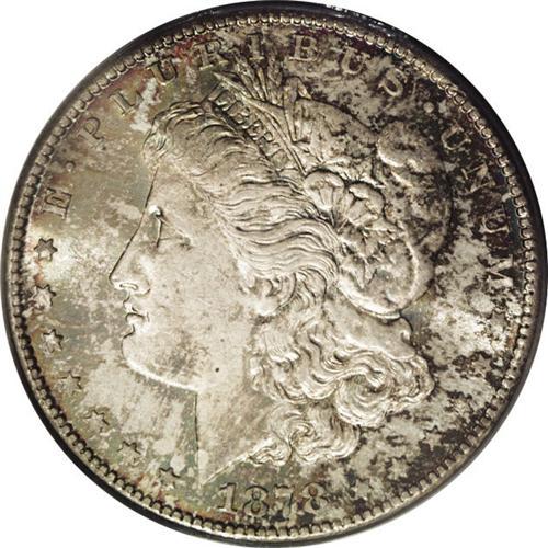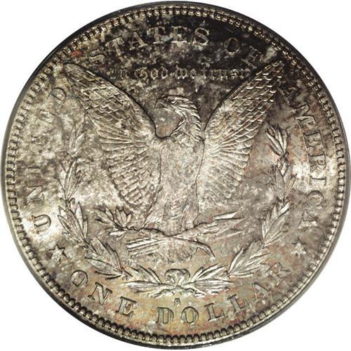 <B>1878-S<img border='0' src='http://www.heritagecoins.com/images/star.gif' width=10 height=10>$1> MS67 PCGS.</B></I> Splendidly patinated in mottled rose, gold, blue-green, and cream-gray hues. Luster blasts through the multicolor toning. This exactingly struck Superb Gem is remarkably unabraded, and is certain to be a subject of admiration from its fortunate next owner. Housed in a green label holder. Population: 19 in 67, 1 finer (9/06).