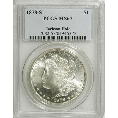 <B>1878-S S$1 MS67 PCGS.</B></I> Ex: Jackson Hole. The availability of this S-mint Morgan through the MS66 grade tier does little to reduce the outstanding beauty of the current specimen. Boldly struck and heavily frosted (as always), both the obverse and reverse are completely white and untoned, with a satiny appearance. As befits the grade, the surfaces are devoid of mentionable bagmarks. Population: 19 in 67, 1 finer (2/07).<BR><I>From The Jackson Hole Collection.</B></I><BR><BR><b>Shipping:</b> Coins & Currency (<a target="_blank" href="http://www.heritageauctions.com/common/shipping.php">view shipping information</a>)