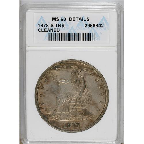 <B>1878-S T$1 --Cleaned--ANACS. MS60 Details.</B></I> NGC Census: (16/319). PCGS Population (18/332). Mintage: 4,162,000. Numismedia Wsl. Price for NGC/PCGS coin in MS60: $404. (#7048)<BR><BR><b>Shipping:</b> Coins & Currency (<a target="_blank" href="http://www.heritageauctions.com/common/shipping.php">view shipping information</a>)