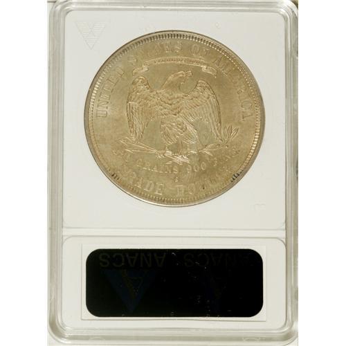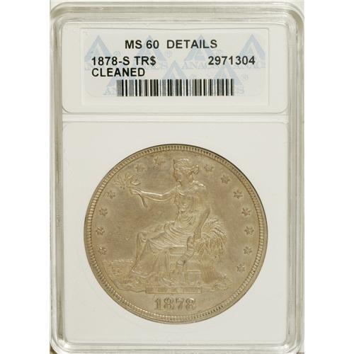 <B>1878-S T$1 --Cleaned--ANACS. MS60 Details.</B></I> NGC Census: (32/642). PCGS Population (18/332). Mintage: 4,162,000. Numismedia Wsl. Price for NGC/PCGS coin in MS60: $500. (#7048)<BR><BR><b>Shipping:</b> Coins & Currency (<a target="_blank" href="http://www.heritageauctions.com/common/shipping.php">view shipping information</a>)
