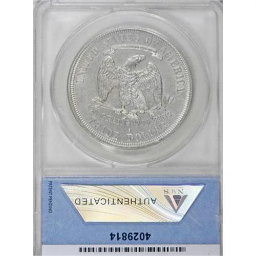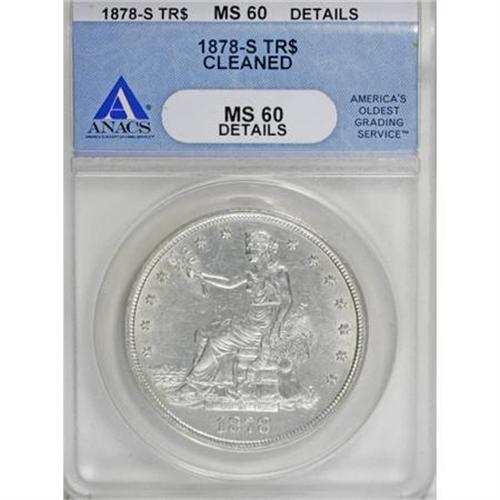 <B>1878-S T$1 --Cleaned--ANACS. MS60 Details.</B></I> Well-defined overall with no trace of wear on the pale silver-gray surfaces. Light, scattered hairlines attest to a past cleaning, though the margins retain a measure of original luster.<BR><BR><B>Coin Engraver:</B> William Barber<BR><BR><b>Shipping:</b> Coins & Currency (<a target="_blank" href="http://www.heritageauctions.com/common/shipping.php">view shipping information</a>)