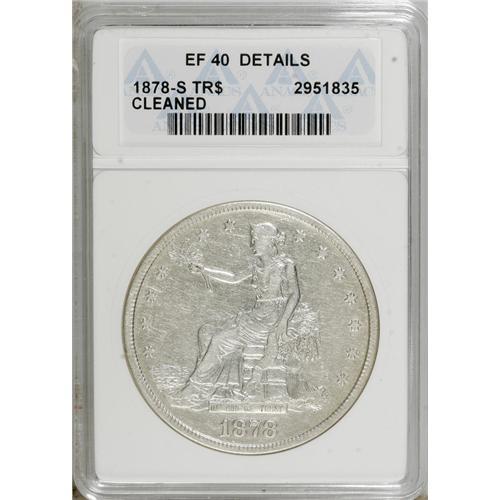 <B>1878-S T$1 --Cleaned--ANACS. VF40 Details.</B></I> NGC Census: (16/493). PCGS Population (30/619). Mintage: 4,162,000. Numismedia Wsl. Price: $133. (#7048)<BR><BR><b>Shipping:</b> Coins & Currency (<a target="_blank" href="http://www.heritageauctions.com/common/shipping.php">view shipping information</a>)