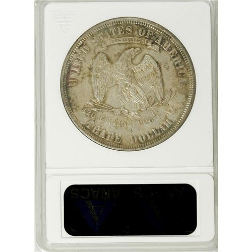 <B>1878-S T$1 --Reverse Damaged--ANACS. AU58 Details.</B></I> NGC Census: (80/333). PCGS Population (87/355). Mintage: 4,162,000. Numismedia Wsl. Price: $279. (#7048)<BR><BR><b>Shipping:</b> Coins & Currency (<a target="_blank" href="http://www.heritageauctions.com/common/shipping.php">view shipping information</a>)
