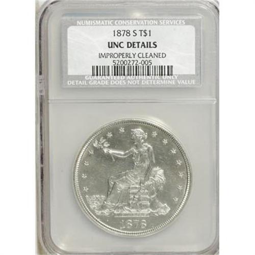 <B>1878-S T$1 --Improperly Cleaned--NCS. Unc Details.</B></I> NGC Census: (0/0). PCGS Population (0/0). Mintage: 4,162,000. (#7048)<BR><BR><B>Coin Engraver:</B> William Barber<BR><BR><b>Shipping:</b> Coins & Currency (<a target="_blank" href="http://www.heritageauctions.com/common/shipping.php">view shipping information</a>)