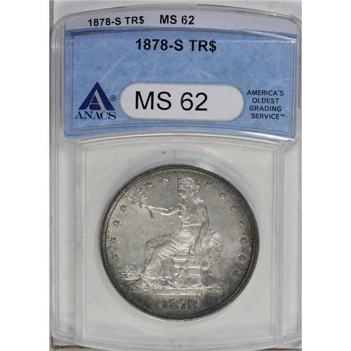 <B>1878-S T$1 MS62 ANACS.</B></I> Highly lustrous with soft pencil-lead patina near the date and along the obverse and reverse periphery. The lightly abraded surfaces are well-defined.<BR><BR><b>Shipping:</b> Coin/Currency (<a target="_blank" href="http://www.heritageauctions.com/common/shipping.php">view shipping information</a>)
