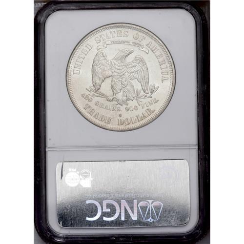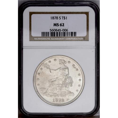 <B>1878-S<T$1> MS62 NGC.</B></I> Light chestnut-brown toning is mostly relegated to the left obverse field. A lustrous and boldly struck final year S-mint trade dollar with wispy marks throughout the fields.