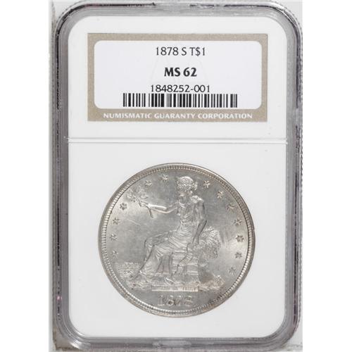 <B>1878-S<T$1> MS62 NGC.</B></I> Nicely struck with great luster. The gold-gray surfaces have patches of auburn at the reverse periphery, and minor abrasions appear on each side.