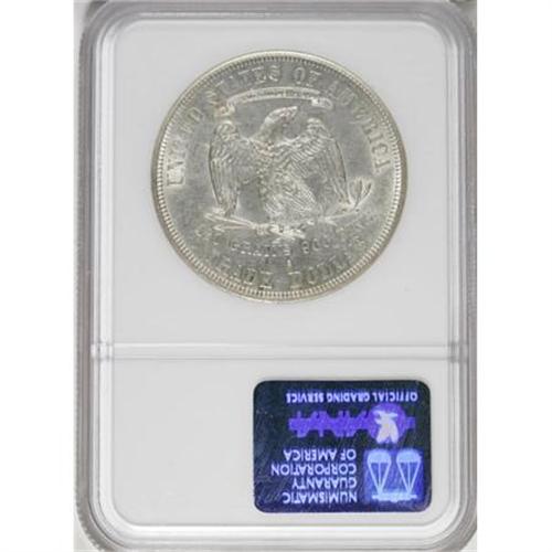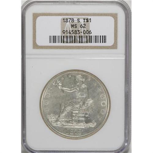 <B>1878-S T$1 MS62 NGC.</B></I> The Trade dollar issues of 1878 would prove to be the last for all Mints save Philadelphia, which continued the design in proof for several more years. This 1878-S example shows pleasing detail and vibrant luster on the reverse, though the silver-gray obverse is slightly subdued. Pleasing despite a number of wispy abrasions.<BR><I>From The Mario Eller Collection, Part One.</B></I><BR><BR><B>Coin Engraver:</B> William Barber<BR><BR><b>Shipping:</b> Coins & Currency (<a target="_blank" href="http://www.heritageauctions.com/common/shipping.php">view shipping information</a>)
