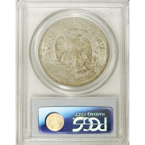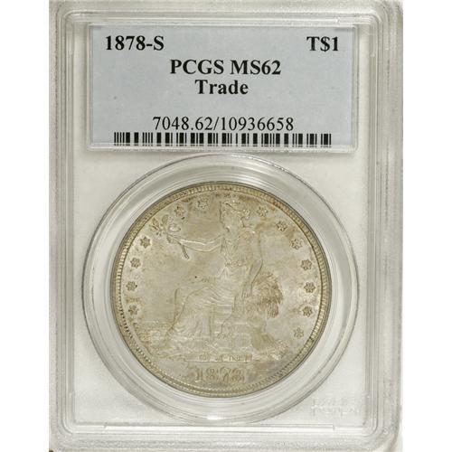<B>1878-S T$1 MS62 PCGS.</B></I> Philadelphia coined no business-strike Trade dollars in 1878, and while Carson City struck a relative handful, the vast majority of Trade dollars from that year hail from San Francisco. This unworn survivor has pleasing definition and pretty luster beneath lovely aqua and tan patina. An area of deeper blue appears to the right of the date.<BR><BR><b>Shipping:</b> Coins & Currency (<a target="_blank" href="http://www.heritageauctions.com/common/shipping.php">view shipping information</a>)