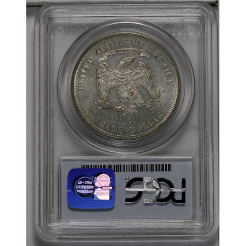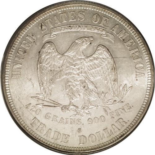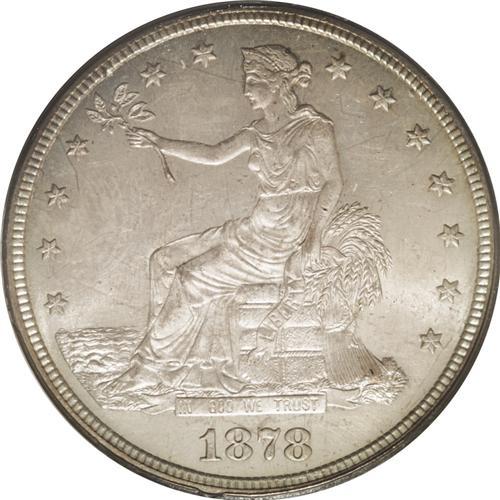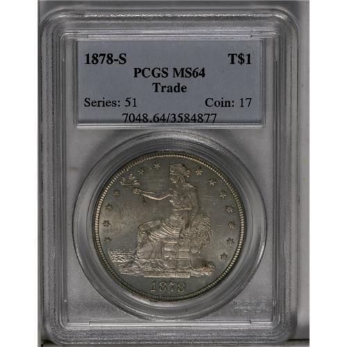 <B>1878-S<T$1> MS64 PCGS.</B></I> This well struck silver type coin has impressive cartwheel shimmer and no mentionable marks. The gentle golden-gray toning is consistent and original. 1878 was the end of the line for the Trade dollar, since silver interests had successfully lobbied for the re-introduction of the silver dollar. Population: 68 in 64, 42 finer (6/06).<BR><I>Ex: Santa Clara Signature (Heritage, 11/02), lot 304.</B></I><BR><I>From The Chief Paduke Collection.</B></I>