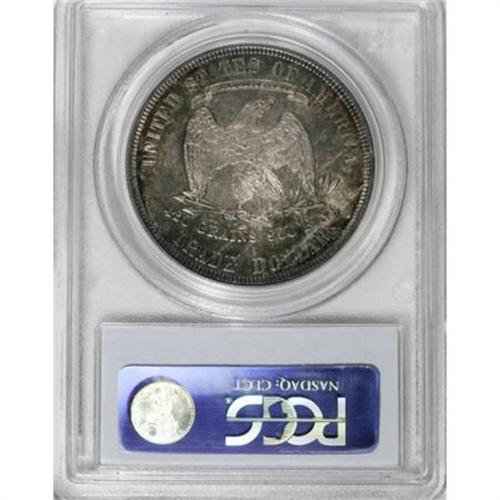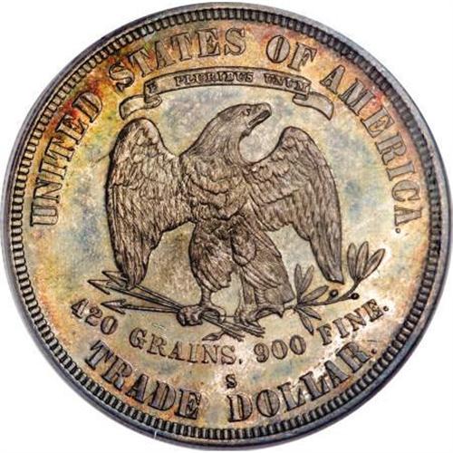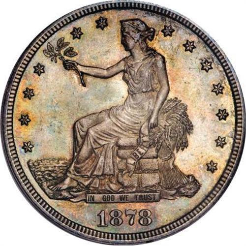 <B>1878-S T$1 MS64 PCGS. CAC.</B></I> Apple-green and golden-brown enrich this moderately prooflike near-Gem. The strike is unusually sharp, even on Liberty's hair and the eagle's legs. Thorough study locates a thin mark between UNITED and the left (facing) wing, but the surfaces are generally impressively undisturbed.<BR><BR><B>Coin Engraver:</B> William Barber<BR><BR><b>Shipping:</b> Coins & Currency (<a target="_blank" href="http://www.heritageauctions.com/common/shipping.php">view shipping information</a>)