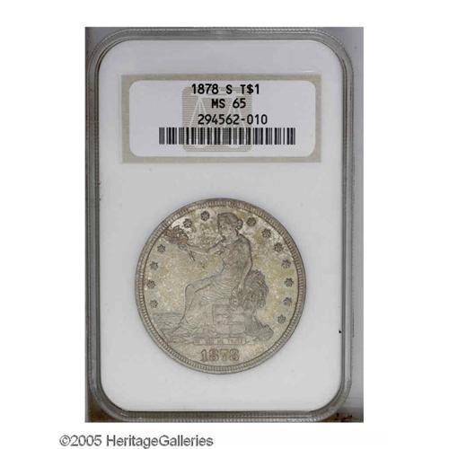 <B>1878-S<T$1> MS65 NGC.</B></I> Breen-5820. Large clear S. Beautifully blended light golden-brown and apple-green toning occasionally cedes to glimpses of ivory-gray color. Vigorous cartwheel luster reveals only minor contact on the cheek and obverse field, while the reverse is splendidly preserved. Exquisitely struck, and decidedly scarce in finer grades. Certified in a former generation NGC holder. Population: 25 in 65, 17 finer (10/05).<BR><I>From The Albert E. Willis Collection.</B></I>