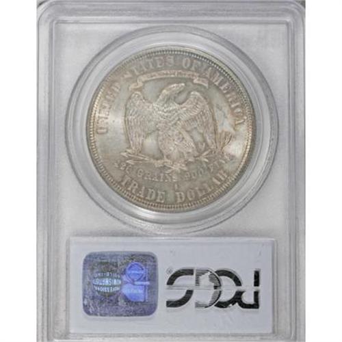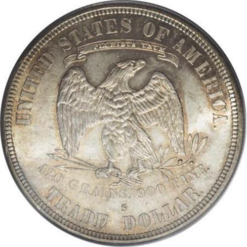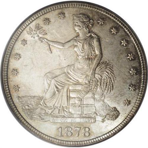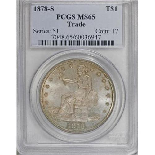<B>1878-S T$1 MS65 PCGS.</B></I> A lovely Gem, approaching the best that PCGS has ever certified, with frosty silver luster that is accented by splashes of golden-brown toning on each side. It is a well-struck specimen with sharp stars, strong head details, and full claws. Population: 17 in 65, 18 finer (10/07).<BR><BR><B>Coin Engraver:</B> William Barber<BR><BR><b>Shipping:</b> Coins & Currency (<a target="_blank" href="http://www.heritageauctions.com/common/shipping.php">view shipping information</a>)