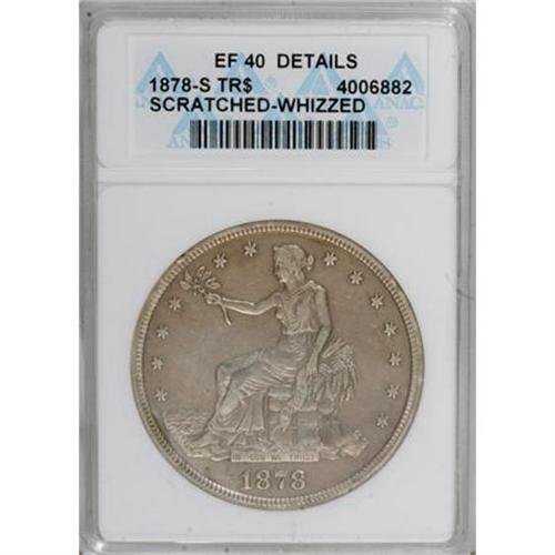 <B>1878-S T$1 --Scratched, Whizzed--ANACS. XF40 Details.</B></I> NGC Census: (16/512). PCGS Population (31/644). Mintage: 4,162,000. Numismedia Wsl. Price for NGC/PCGS coin in XF40: $135. (#7048)<BR><BR><B>Coin Engraver:</B> William Barber<BR><BR><b>Shipping:</b> Coins & Currency (<a target="_blank" href="http://www.heritageauctions.com/common/shipping.php">view shipping information</a>)