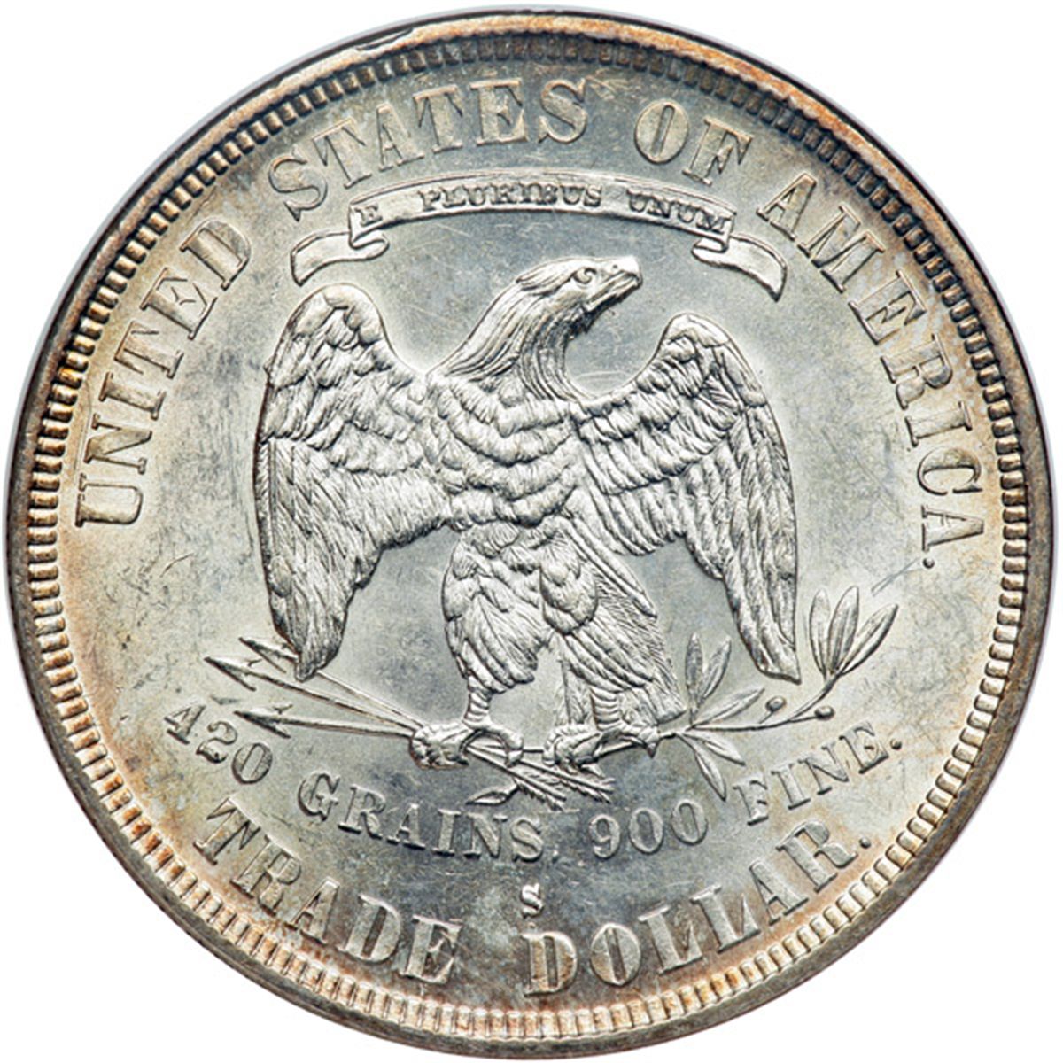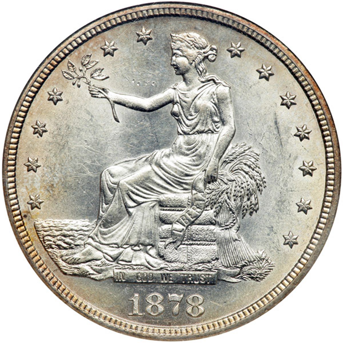 1878-S Trade Dollar. NGC graded MS-62. A nice BU example with a touch of golden color about the borders.