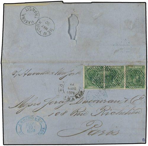 1878 STGO. DE CUBA a PARIS. Circulada con tres sellos de 25 ctvos. verde con mat. ovalado con letras en negativo DM aplicada en el correo de alcance enviado en el vapor de cabotaje de Santiago hacia La Habana. Circulada via New York donde se le estampó el raro fechador NEW YORK-HAVANA TRANSIT. MAGNIFICA y MUY RARA.