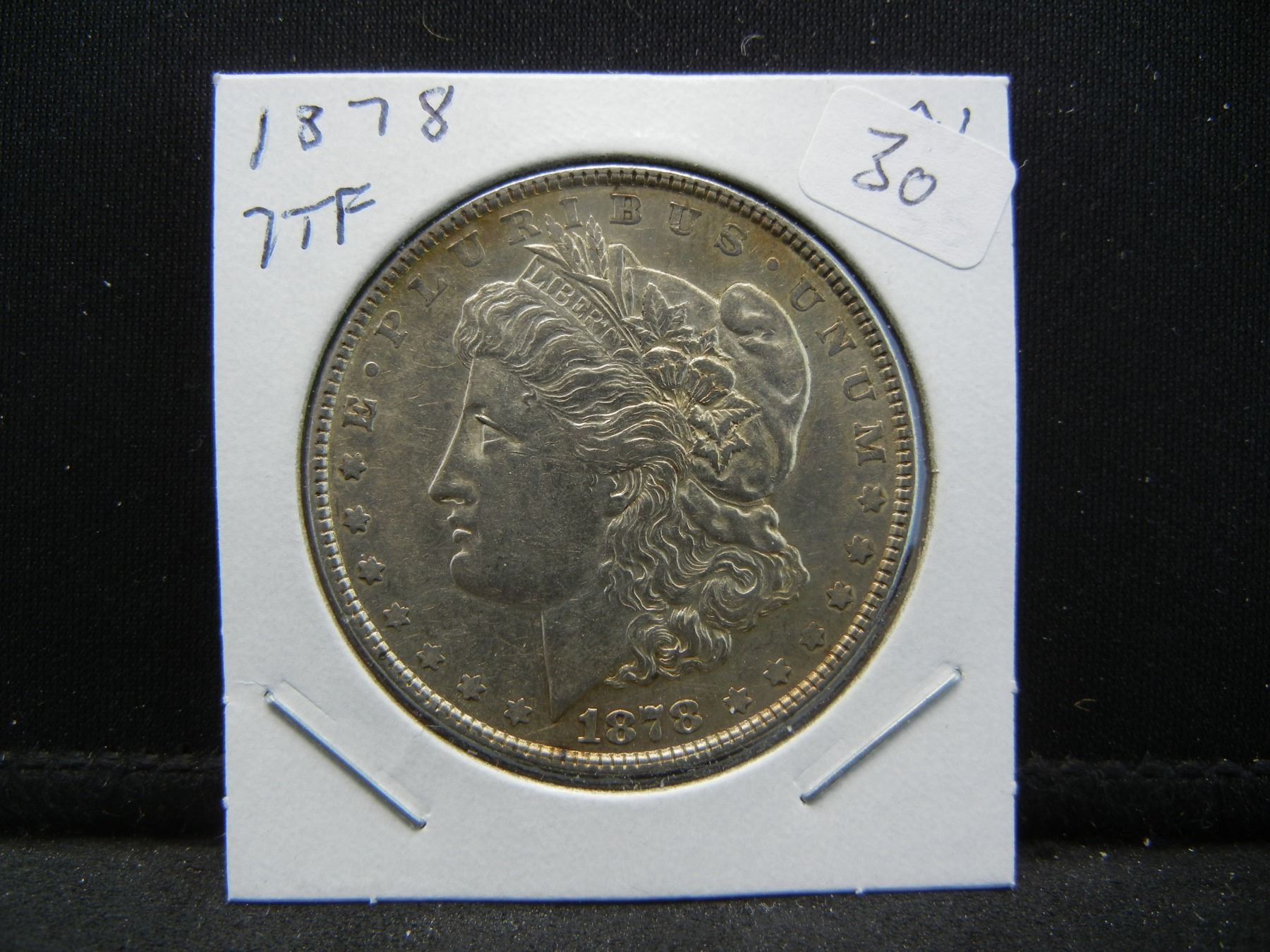 1878 Seven Tail Feather Morgan Dollar. AU 55.