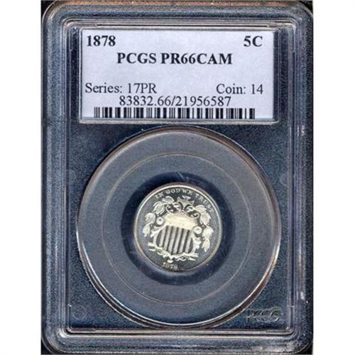 <b>1878 Shield Nickel. PCGS graded PF66 CAM.</b> Proof mintage was only 2,350 pieces. A glossy coin and a gem by any benchmark. What's more, this has an engaging display of deep mirror iridescence that revolves around the highly lustrous silver frosted devices of this scarce Proof-only gem. The strike is strong for the date, with just outstanding detail seen in the smallest component of the shield lines or leaf veins. This one would make the designer, James Longacre feel proud to have left his mark on America's coinage <b>(PCGS # 83832)</b>