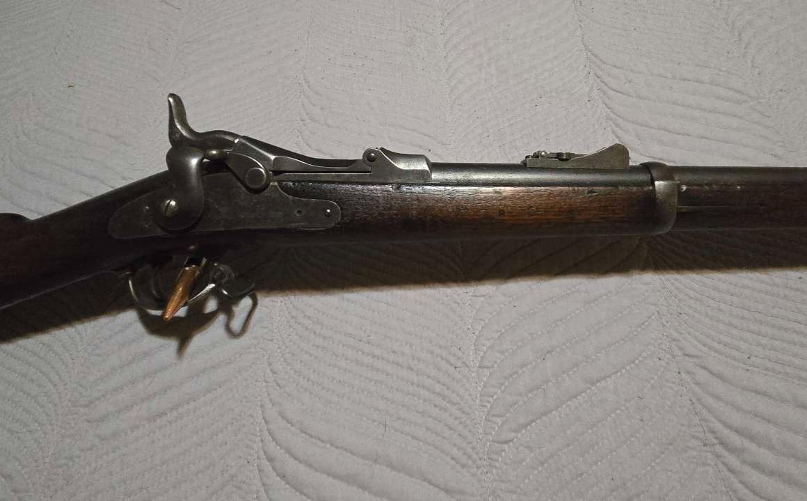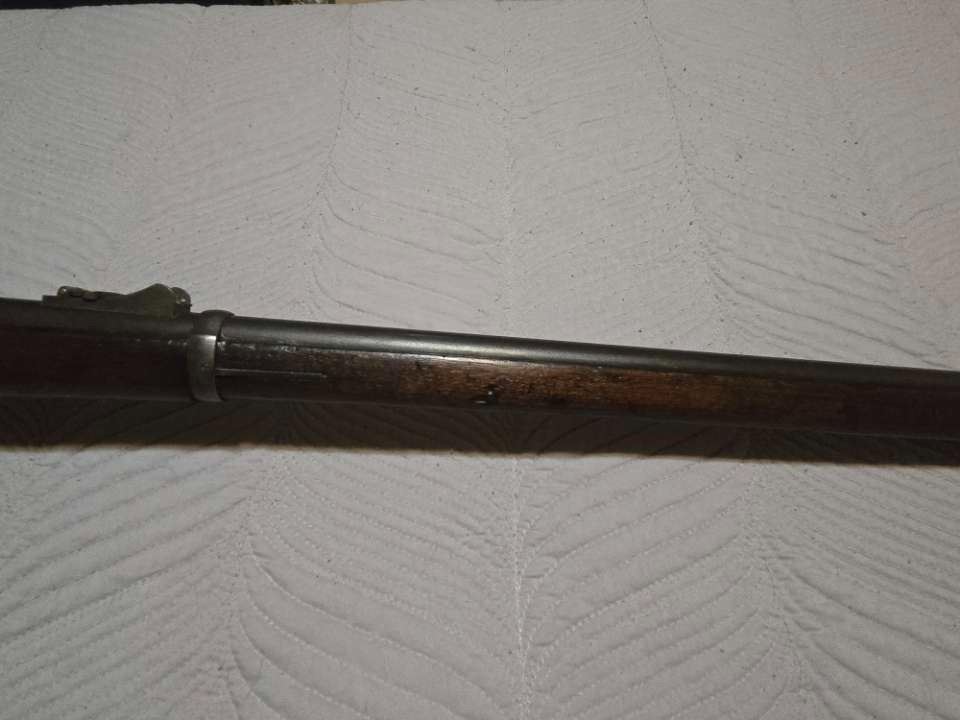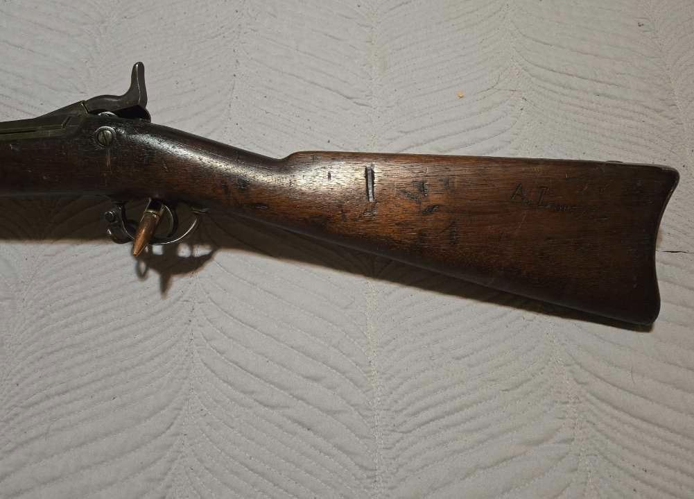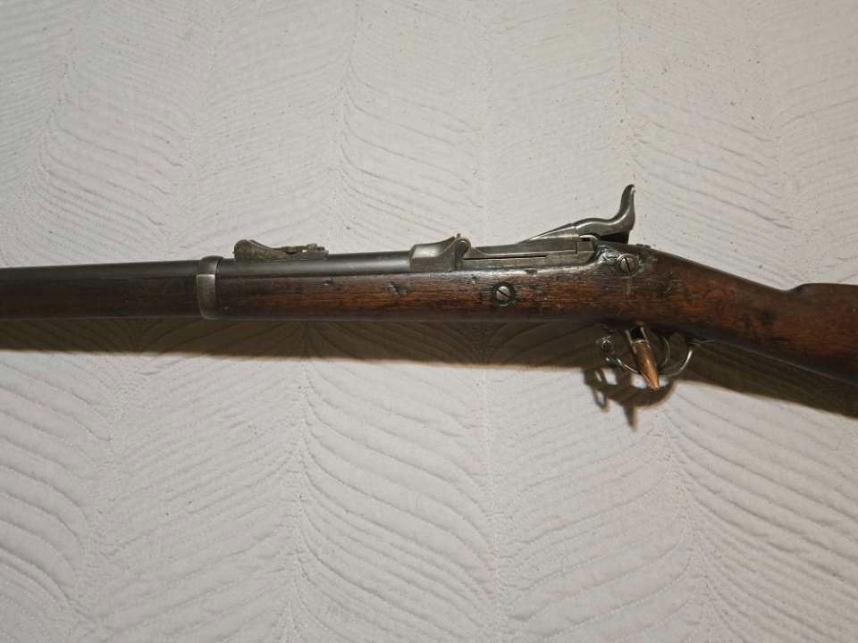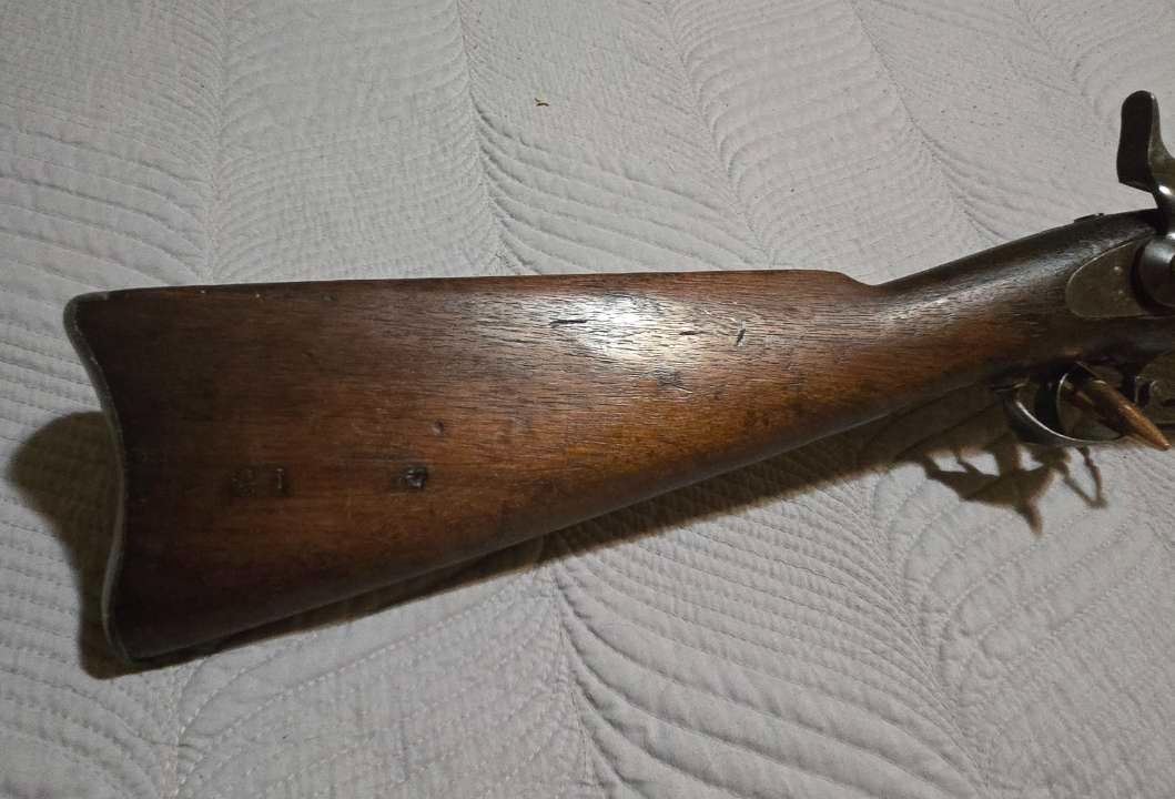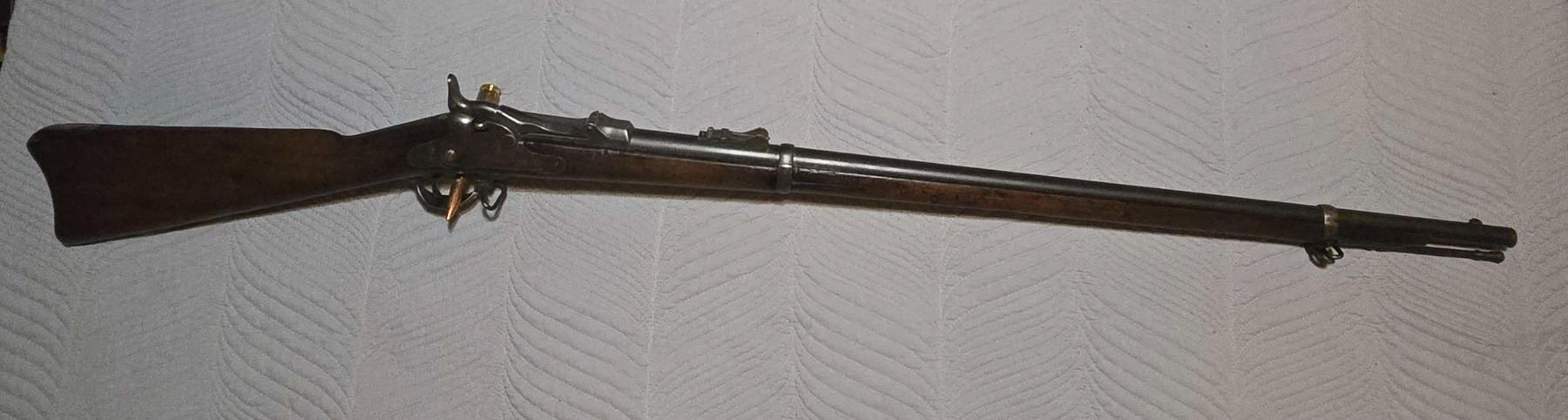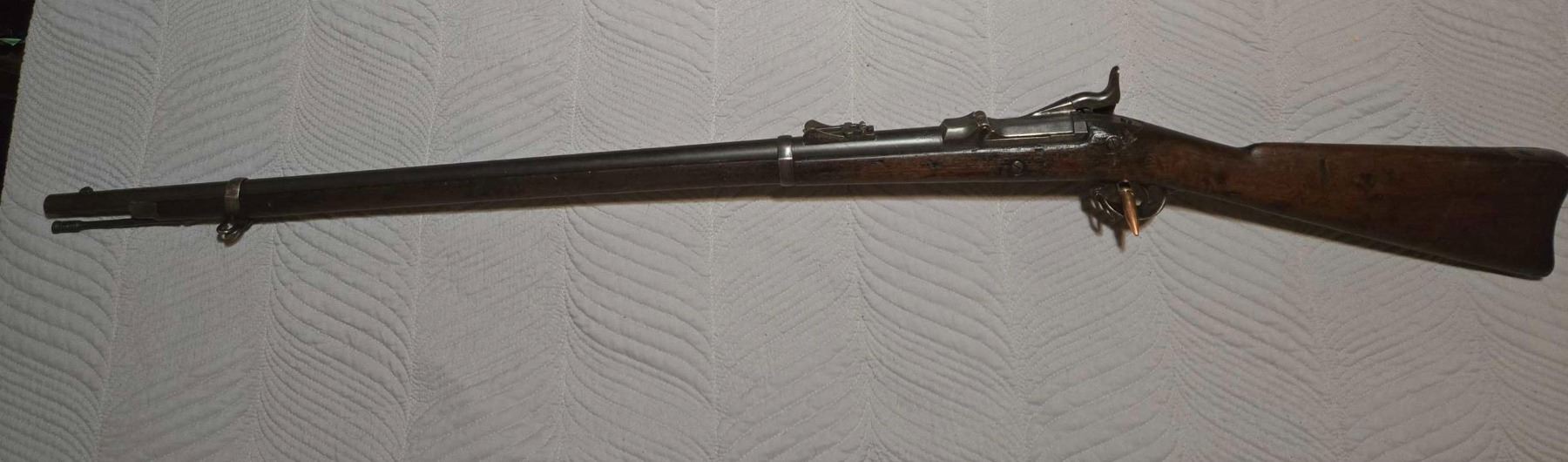 antique status. 45-70. Finish has turned grey, mechanics work well. no cracks in the stock. has correct bayonet.