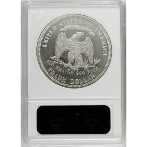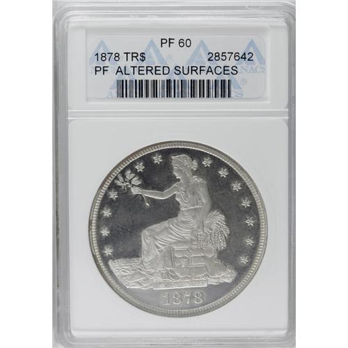 <B>1878<T$1>--Altered Surfaces--ANACS. PR60.</B></I> This proof-only Trade dollar has been artificially frosted to create the look of a modern white-on-black cameo proof. Sharply struck and without obvious marks. The tops of E PLURIBUS UNUM are die doubled.