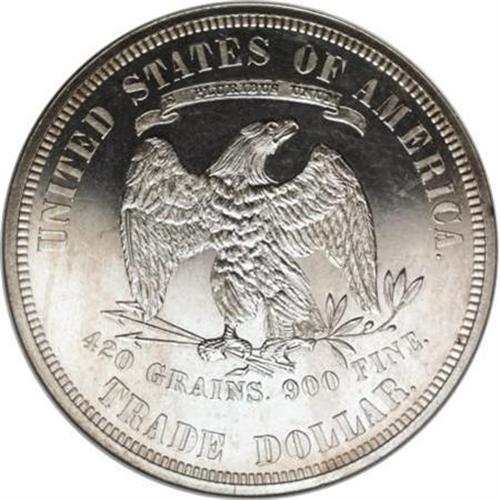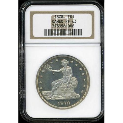 <B>1878 T$1 PR63 Cameo NGC.</B></I> Since the Philadelphia Mint had to concentrate on production of Morgan dollars stipulated by the Bland-Allison Act, the few proof trade dollars coined early in the year were the only production of the design at that Mint. Meanwhile, the branch mints in Carson City and San Francisco had time to produced a quantity of trade dollars while they waited for Morgan dollar dies to arrive from Philadelphia. This lovely Cameo proof has excellent contrast and only a hint of gold toning.<BR><BR><b>Shipping:</b> Coins & Currency (<a target="_blank" href="http://www.heritageauctions.com/common/shipping.php">view shipping information</a>)