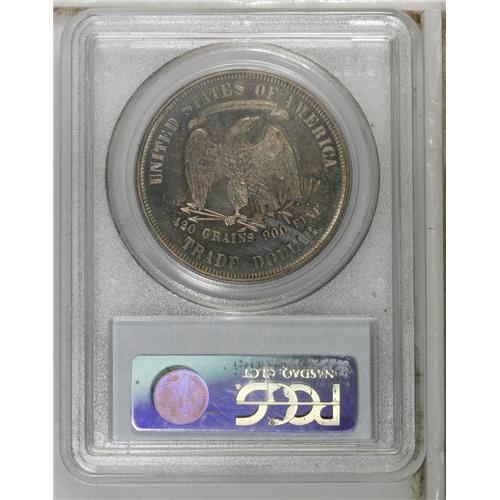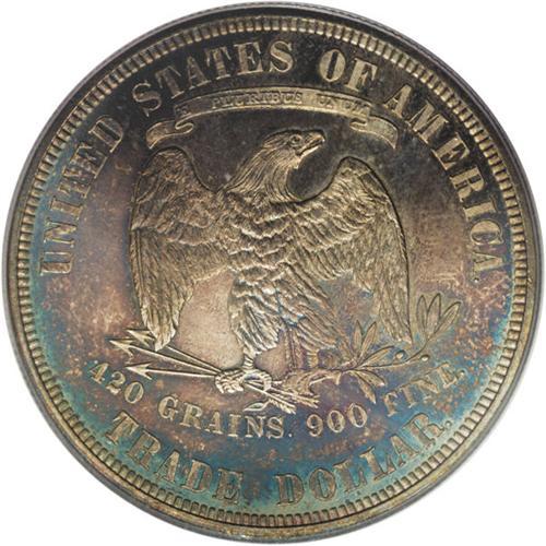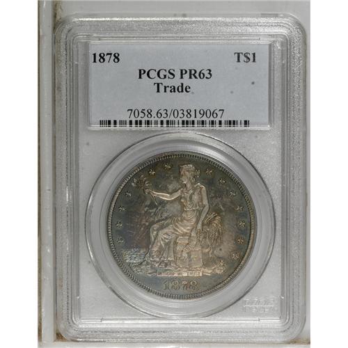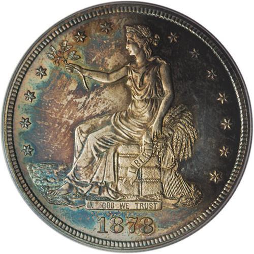 <B>1878 T$1 PR63 PCGS.</B></I> Dramatic ocean-blue, mauve-red, and honey-gold toning adorns this crisply struck and flashy specimen. A few faint slide marks are noted on Liberty's knees and lower hand. 1878 is the first of the proof-only Trade dollar issues, which would continue until 1885, although the final two dates are essentially uncollectible.<BR><BR><b>Shipping:</b> Coins & Currency (<a target="_blank" href="http://www.heritageauctions.com/common/shipping.php">view shipping information</a>)