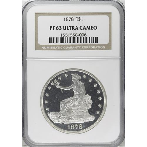 <B>1878 T$1 PR63 Ultra Cameo NGC.</B></I> First of the proof-only Trade dollar issues from Philadelphia, only 900 pieces were struck in 1878. This untoned specimen is deeply reflective in the fields and boasts dramatic contrast with the snowy-white major devices. Population: 1 in 63, 3 finer (12/06).<BR><BR><b>Shipping:</b> Coin/Currency (<a target="_blank" href="http://www.heritageauctions.com/common/shipping.php">view shipping information</a>)