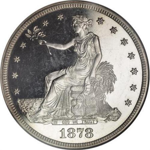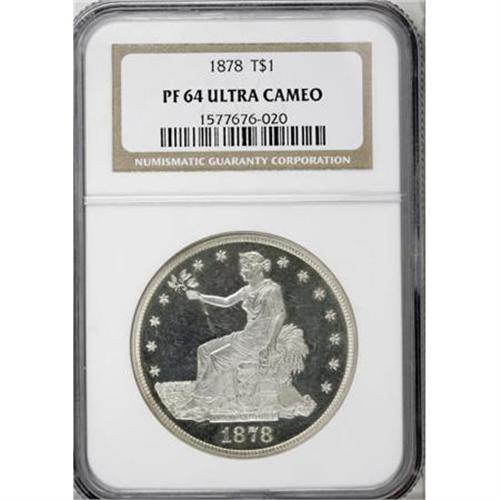 <B>1878 T$1 PR64 Cameo NGC.</B></I> From a mintage of a mere 900 pieces comes this proof-only issue, the only such issue of the type manufactured while other mints continued to make circulation strike coins. This piece has light pale gold color overlaying brilliant mirrored surfaces and heavily frosted devices. The few visible surface marks do not detract at all from this coin's beauty.<BR><BR><b>Shipping:</b> Coins & Currency (<a target="_blank" href="http://www.heritageauctions.com/common/shipping.php">view shipping information</a>)