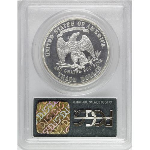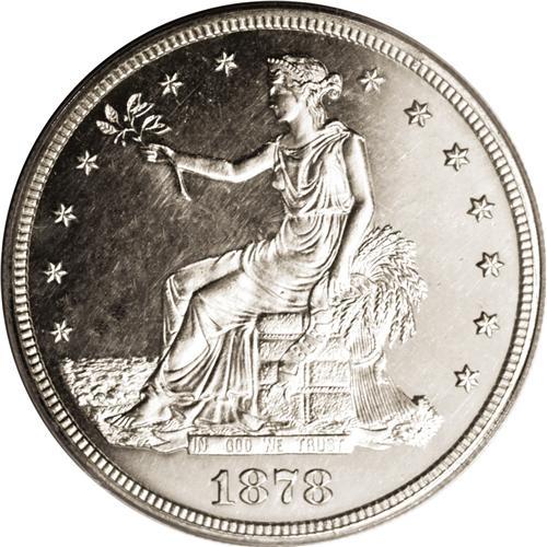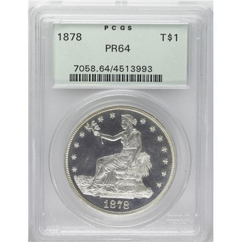 <B>1878 T$1 PR64 PCGS.</B></I> This year marks the first in which the Philadelphia Mint produced only proof Trade dollars. The present near-Gem is a snow-white survivor from an original mintage of just 900 pieces. The contrast is remarkable, though unrecognized by PCGS, and a handful of hairlines are minor annoyances at worst. Population: 67 in 64, 17 finer (12/06).<BR><BR><b>Shipping:</b> Coin/Currency (<a target="_blank" href="http://www.heritageauctions.com/common/shipping.php">view shipping information</a>)